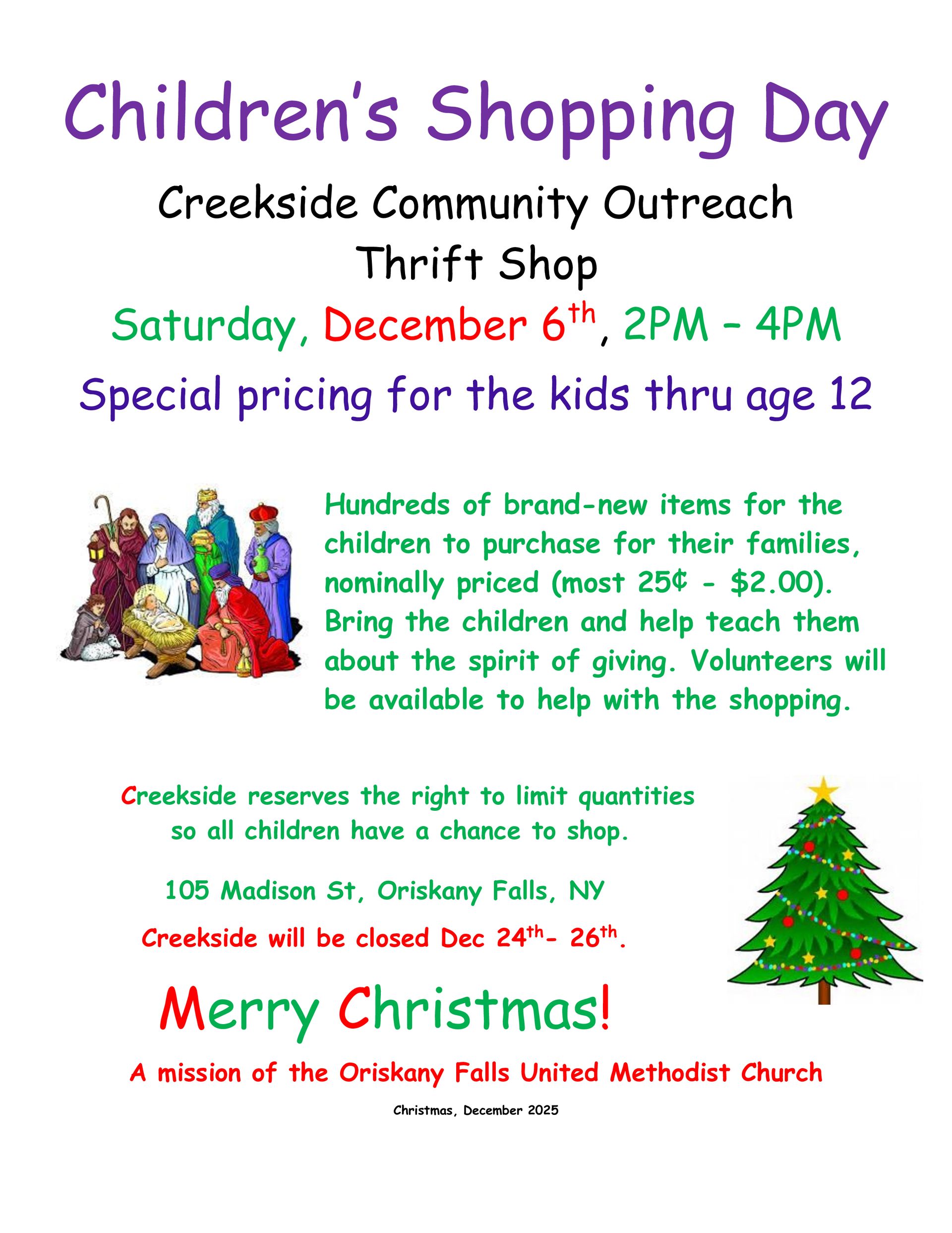is an annual event at Creekside. We transform our backroom work area into a shopping room for the children with all brand new items we have either collected or bought over the course of the year for them to shop with the help of an elf (one of our volunteers) in order to keep their selections a surprise from the recipients! We hoppe to give them a little fun and help them learn a little about giving and finance at the same time. Bring your children, up to age twelve, down to Creekside on Saturday, December 6, between 2 - 4 pm. You'll be glad you did!